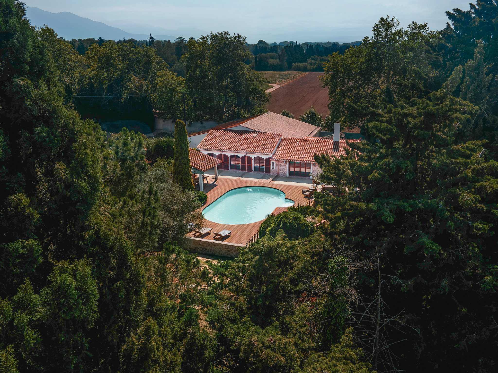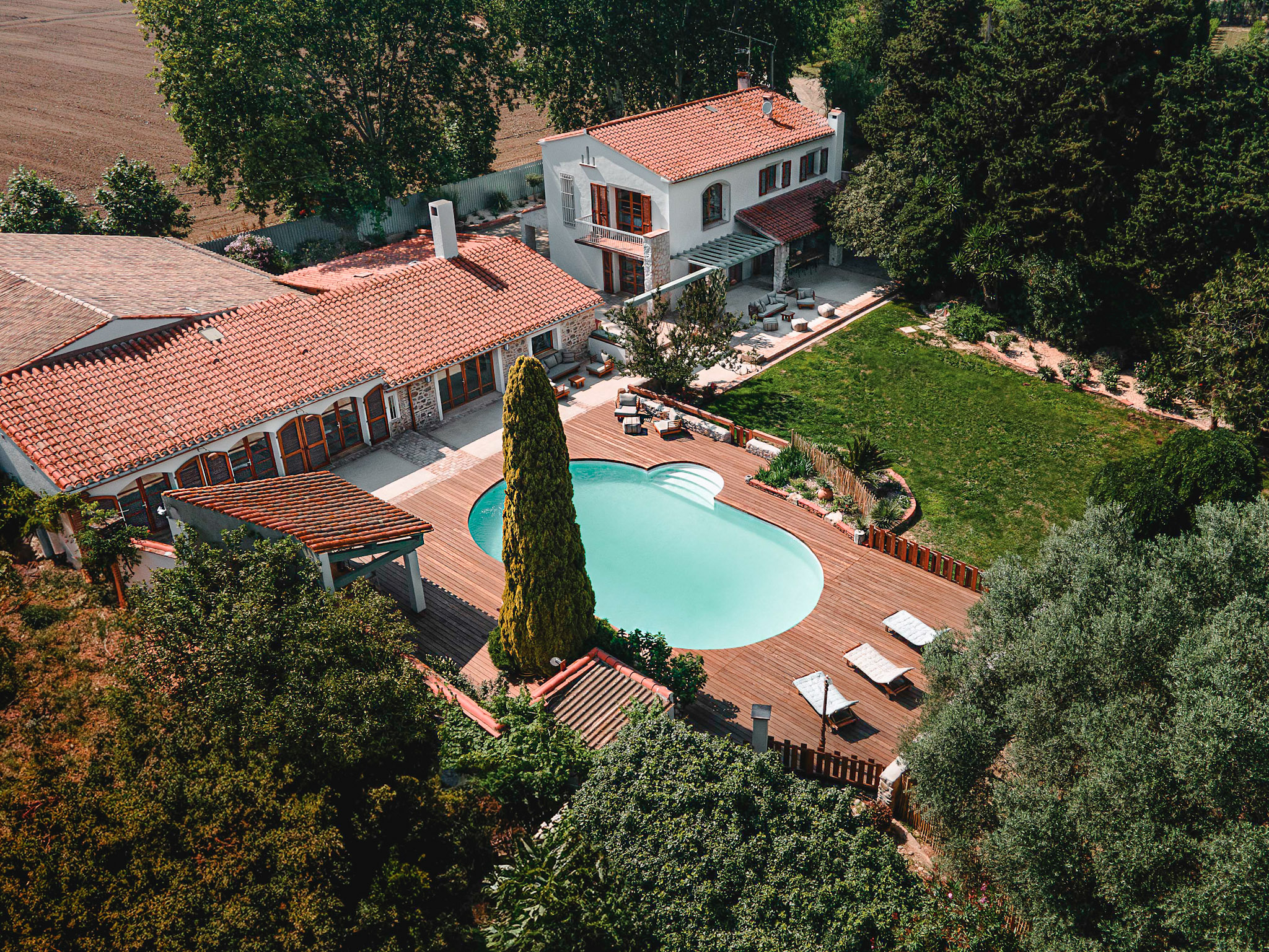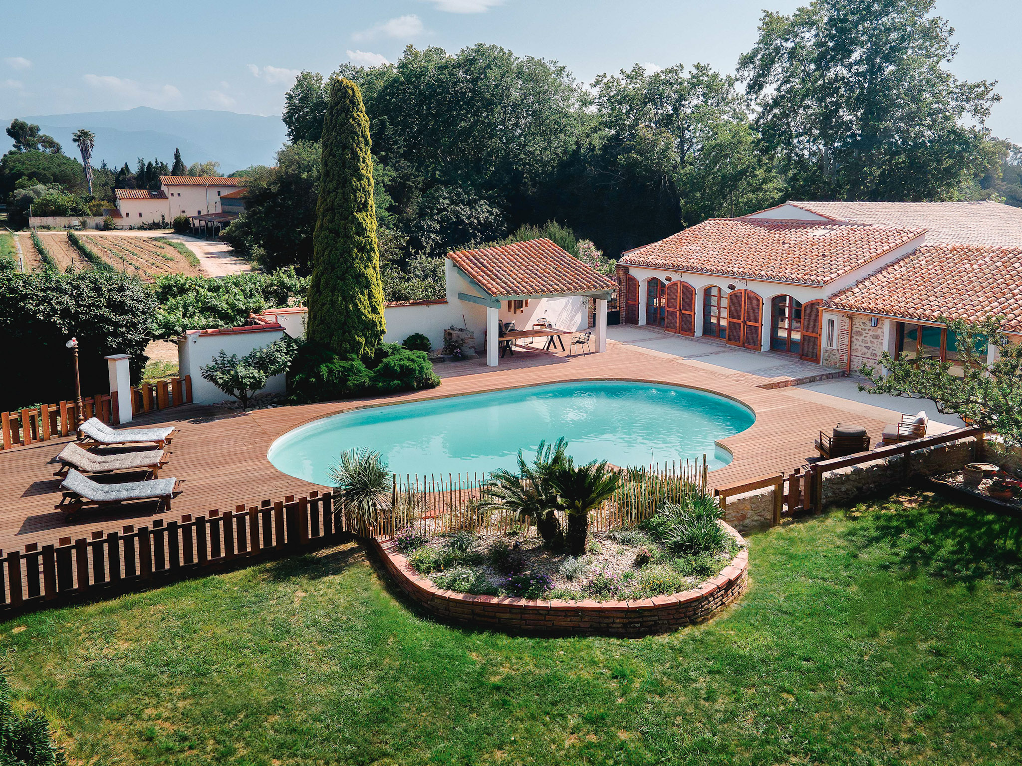 Just 7 minutes from the beach, Mas du Chemin de la Mer offers a peaceful retreat in the heart of the Pyrénées-Orientales, divided into two houses. With seven rooms decorated in a Mediterranean spirit, warm communal spaces, a lush garden and a swimming pool, every moment spent here is imbued with tranquility. Whether you're planning a vacation with family, friends or a business event, this mas offers the ideal setting for a reunion.