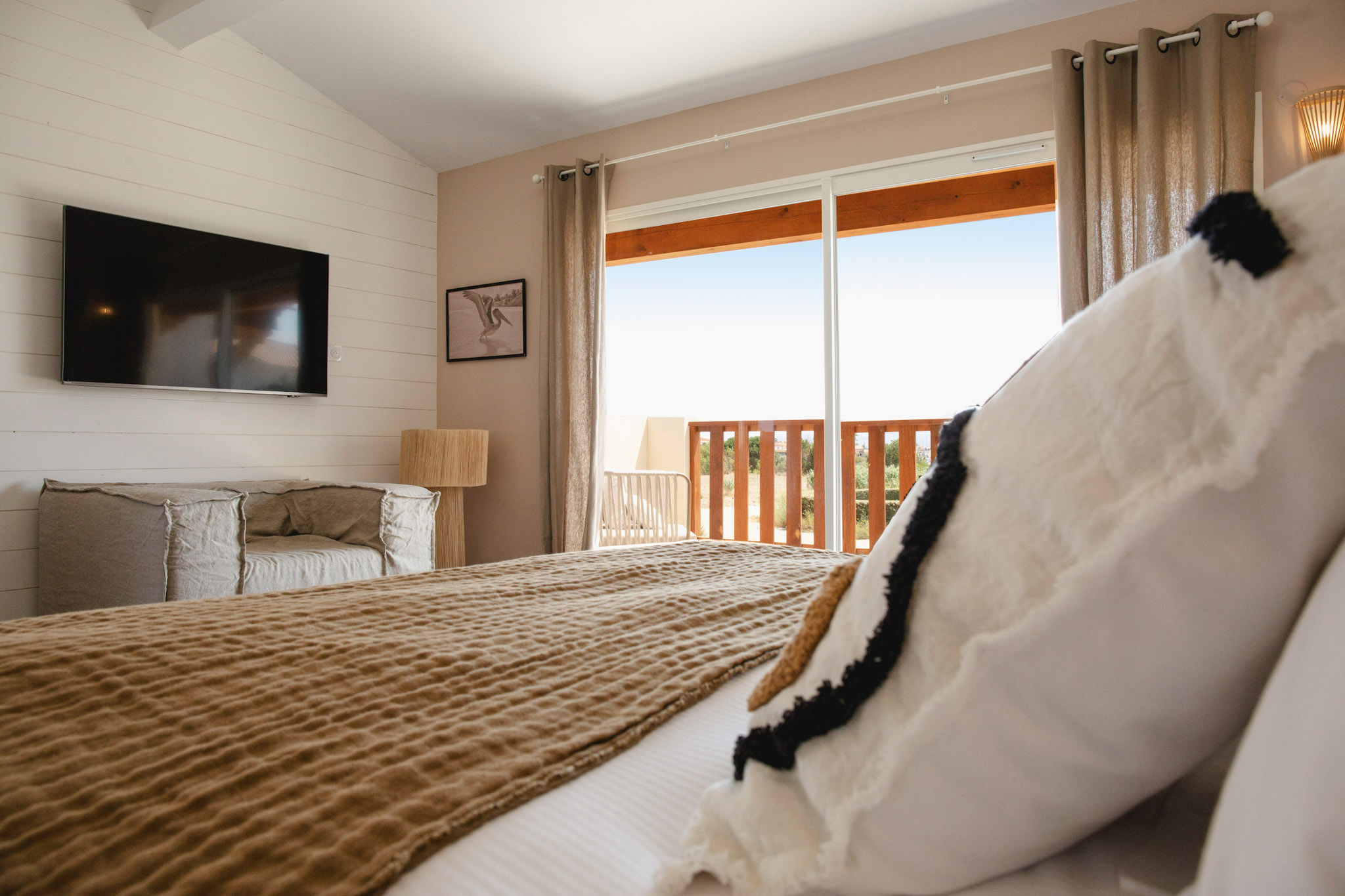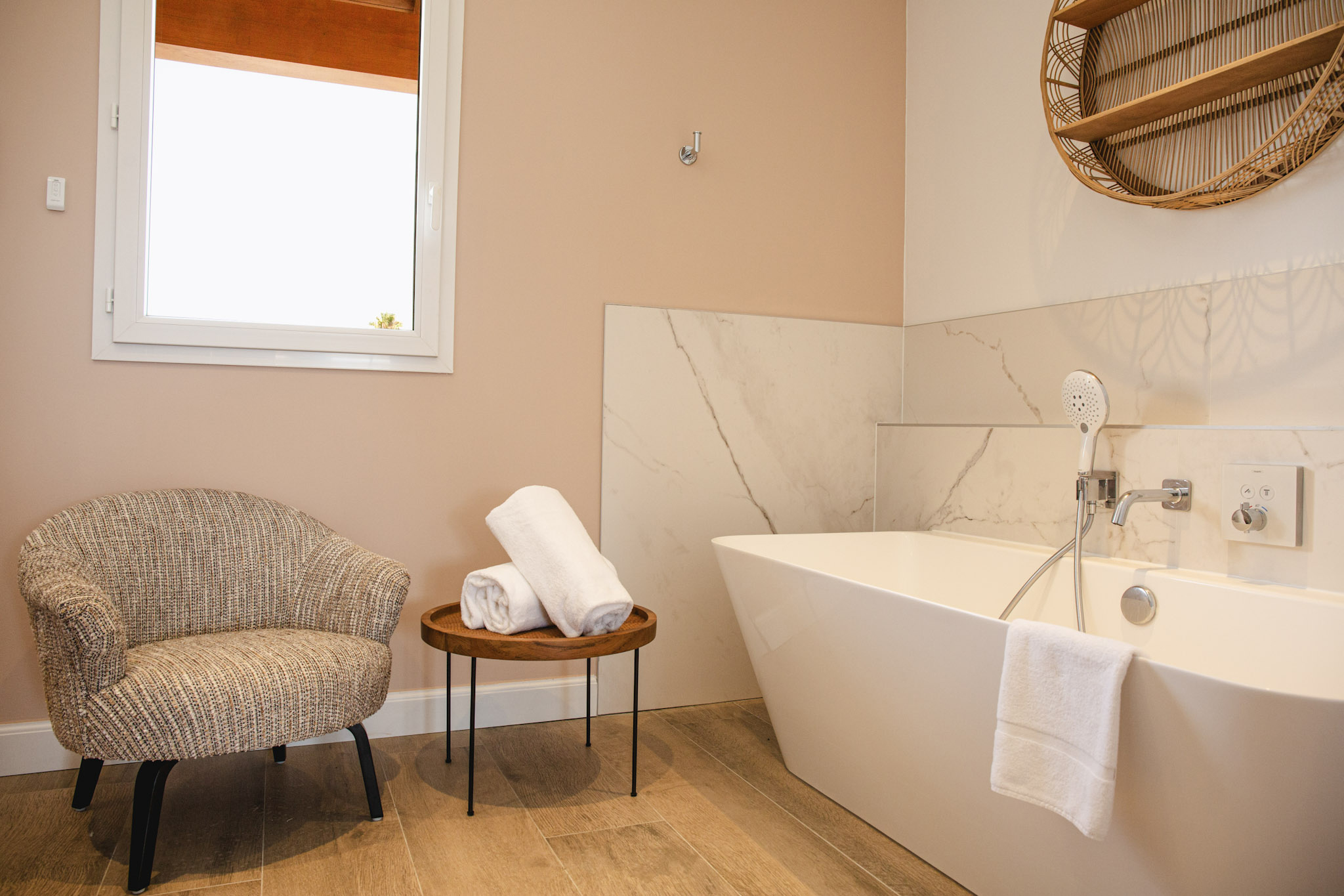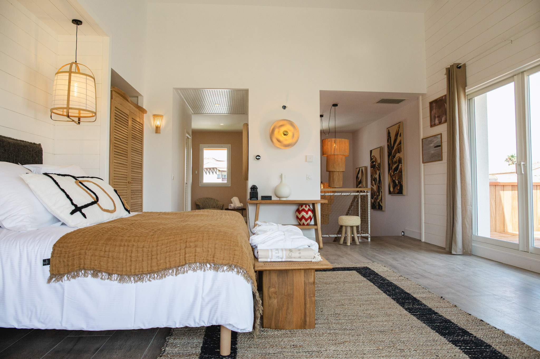 This 45m² suite is located on the 1st floor of our peninsula villas adjoining the large L'Ile de la Lagune house, just a few steps from the small wooden pontoon. Both spacious and intimate, they boast an elegant space as well as a furnished terrace with a private Jacuzzi, with a breathtaking view of the blue sky and the surrounding area.