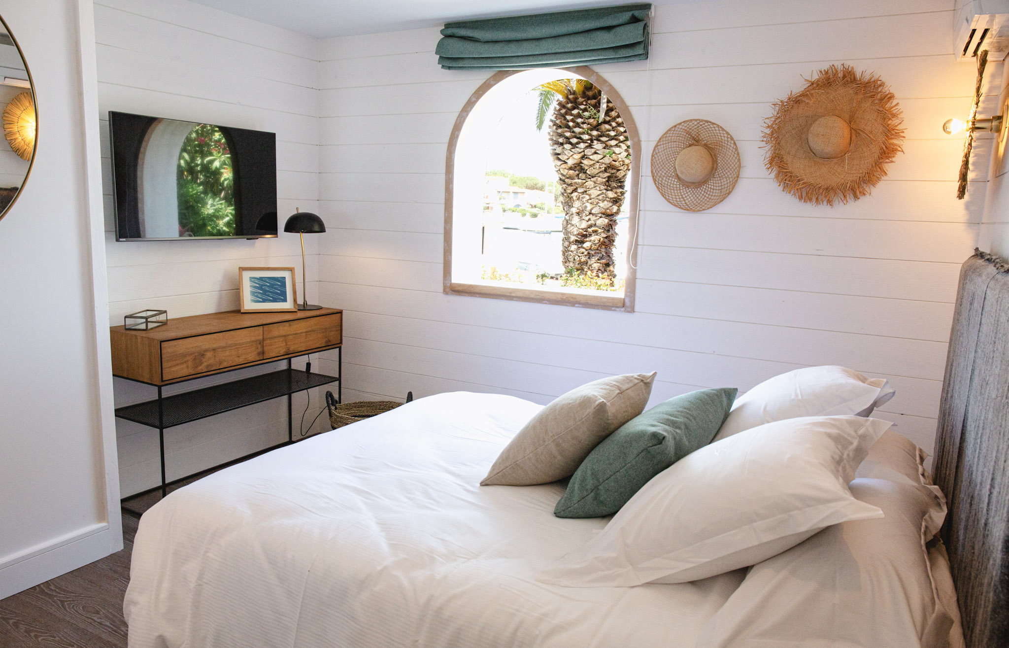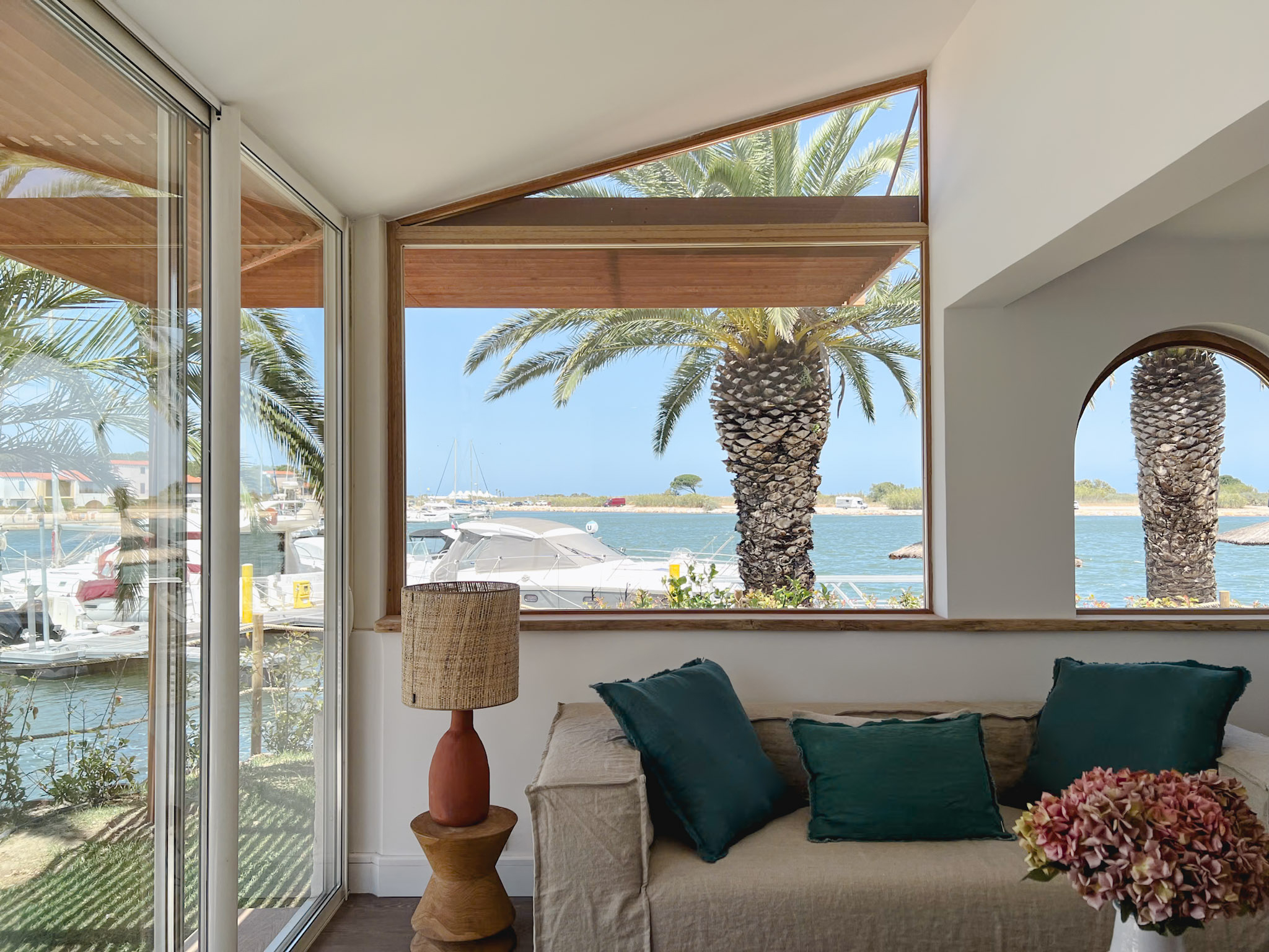 Esta "Casita en la Playa" acoge a familias o grupos de amigos para unas vacaciones excepcionales con los pies en la arena. Con sus 3 habitaciones, su cocina totalmente equipada y su gran terraza, esta villa permite disfrutar de la isla de una forma diferente, con total libertad. Los grandes ventanales dan directamente a la laguna, al pantalán y a los barcos amarrados... Un ambiente auténticamente meridional, auténticamente mediterráneo.